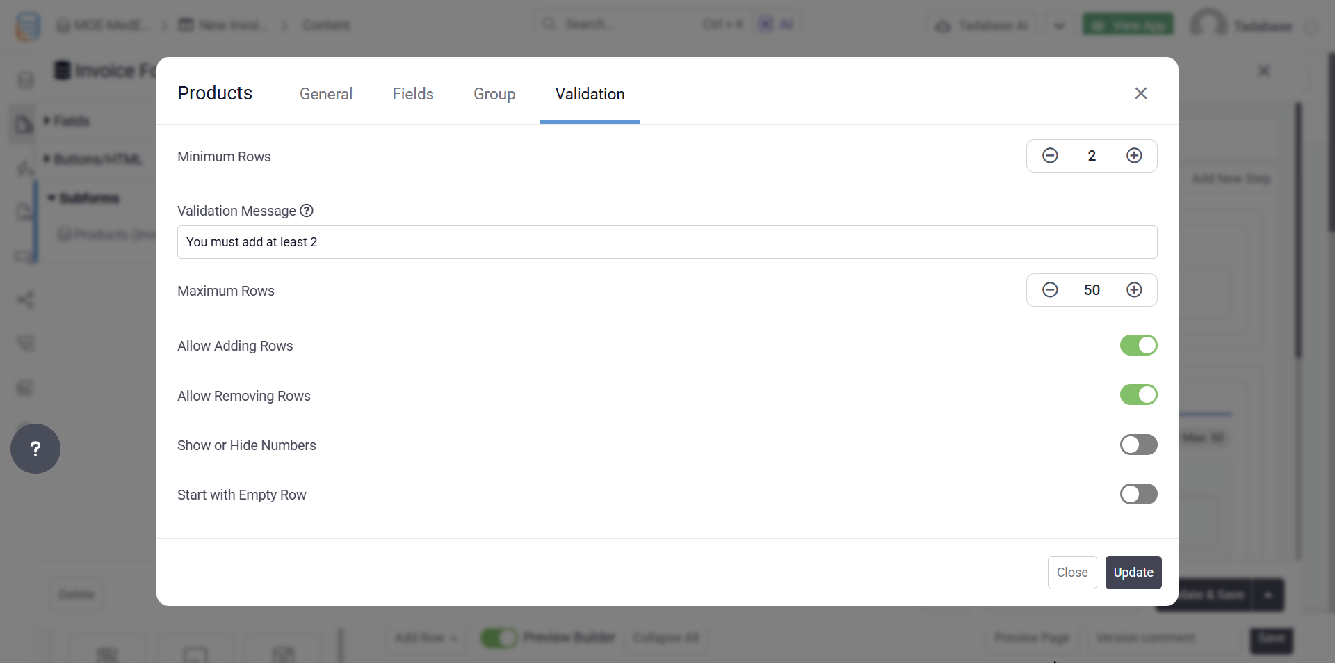 You can now customize validation rules for subform items, including required fields, minimum or maximum rows, and other conditions to help ensure data consistency.